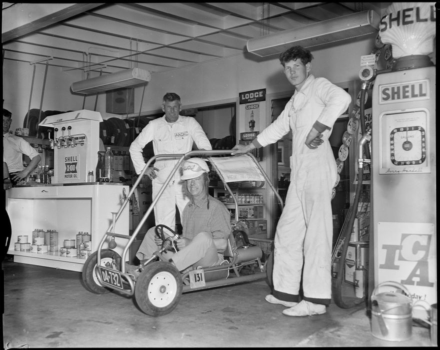 This image was taken for a story that ran in The Manawatu Evening Standard on 3 December, 1959. “The new craze of Go-karting struck Palmerston North yesterday afternoon with the arrival of this Go-kart from Auckland. Three drivers, Mr J. Stevens (left), John Stevens (right) and seated Mr D. Sinton, the designer, took 10.5 hours’ running time to reach Palmerston North. Shortly after 9 o’clock this morning they were on their way to Wellington.”