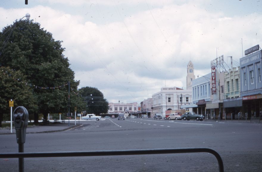 A Palmerston North street view with the Millar & Giorgi, the Meteor Theatre and Watson Bros. in the foreground, and the Post Office in the background. The T&G clock tower can be see behind this street view.