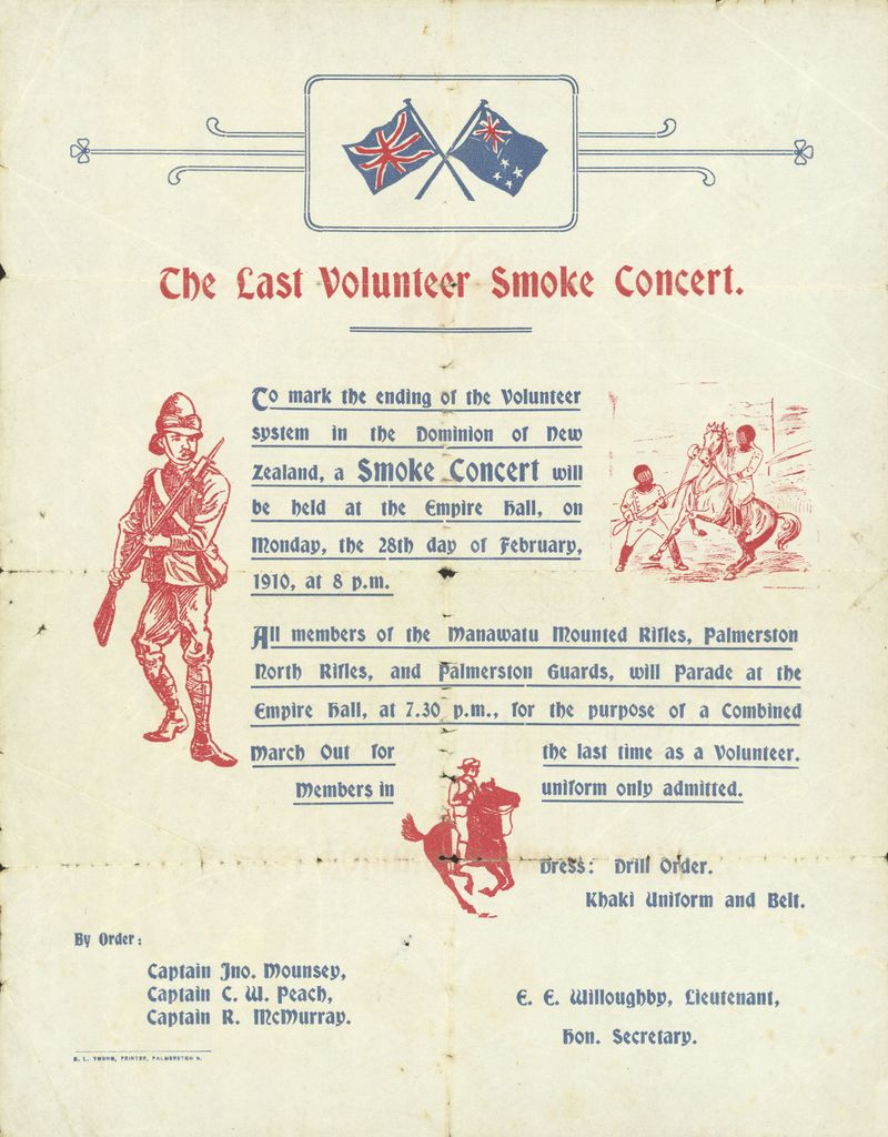 - A handbill announcing the concert to mark the end of the Volunteer troops system in New Zealand. The concert was held at the Empire Hall, Palmerston North, 18 February 1910.