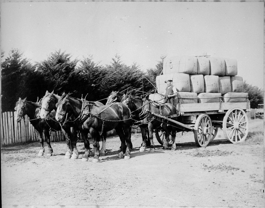 A handwritten caption on the back of the photograph states that the driver of the wagon is a Mr Frank Palmer, Photographed at Wesley Gordon's farm, Waituna West.