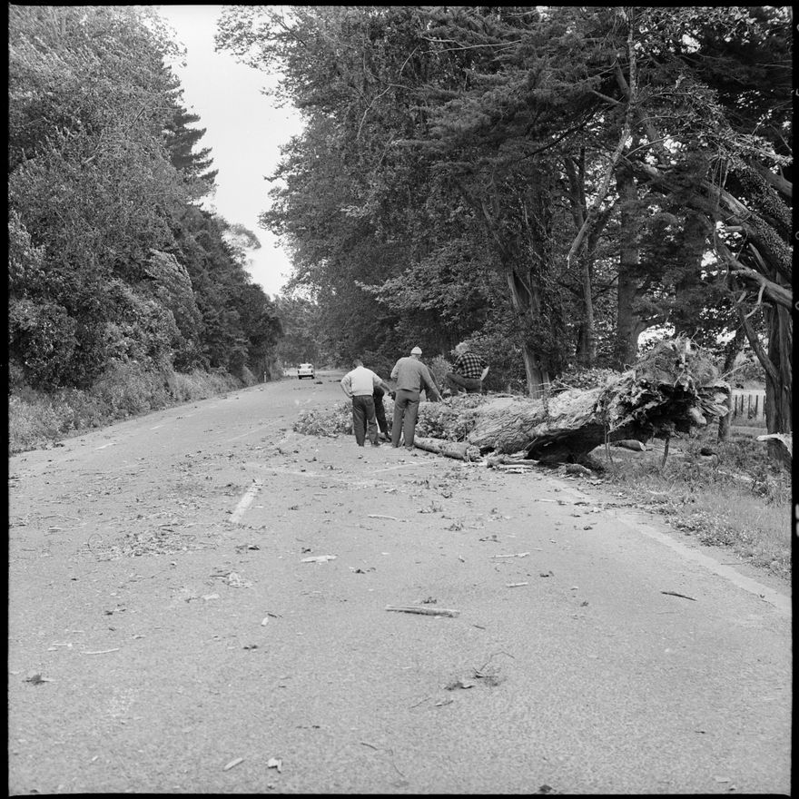 This image was taken for a story that ran in The Manawatu Evening Standard on 30th December 1965 "This image shows the main Palmerston North - Shannon highway which was blocked for half an hour when this tree was blown over the road near Massey University."