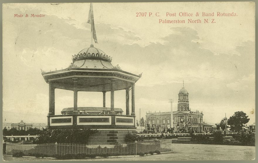This postcard of the Band Rotunda in The Square was possibly taken to mark the opening of the Post Office (corner of Main Street East and The Square). Note the flags and crowds of people. The Band Rotunda featured here was the first of two built in The Square. Constructed in 1899, this incarnation was shifted to the Victoria Esplanade in 1907. A second larger band rotunda was then built. It was demolished in 1956 to make way for the Hopwood Clock Tower.