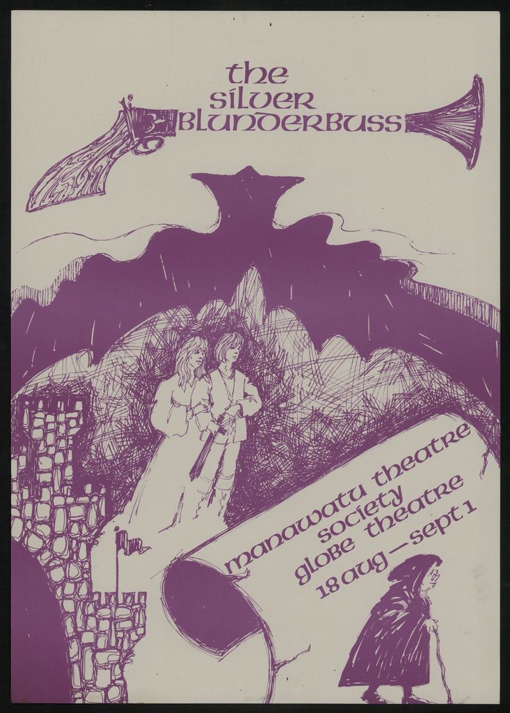 "The Silver Blunderbuss. Manawatu Society. Globe Theatre. 18 Aug - Sept 1." Part of a collection of posters that were displayed in the Public Library in the 1970s - 1980s.