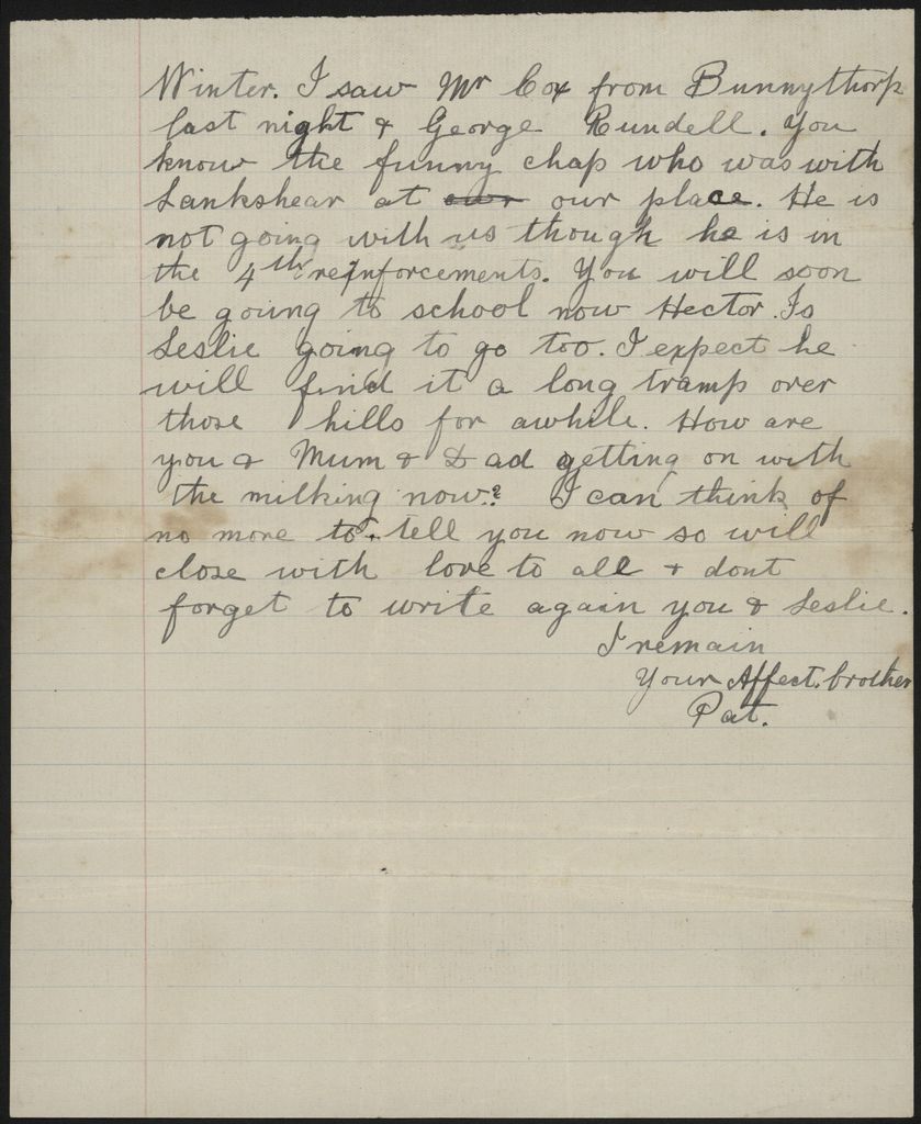 Pat (Percival) Argyle (1890-1915) was the son of Henry and Alice Argyle of Bunnythorpe. This letter is from Pat to his younger brothers Hector and Leslie, from Trentham Army training camp during WWI. The letter tells of the training and expected departure.