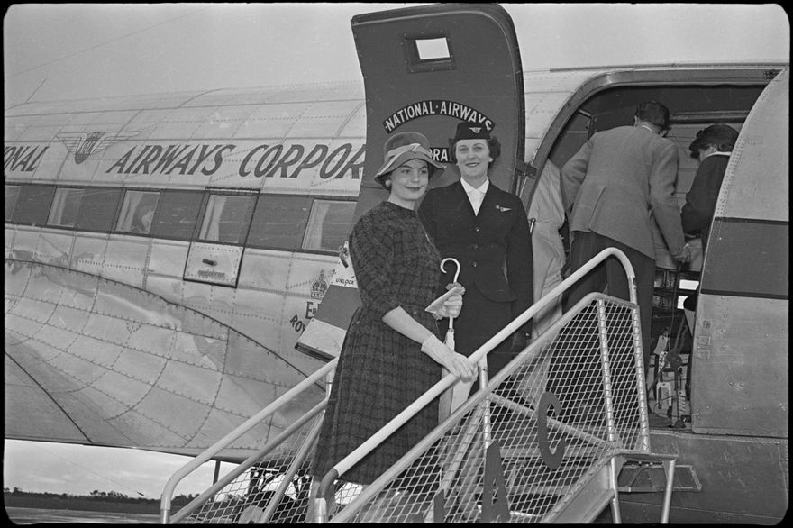 Caption: “Miss Helen Wilson with air hostess Miss Sargeant on the steps of the N.A.C. plane which took her on the first step of her journey to Australia.”