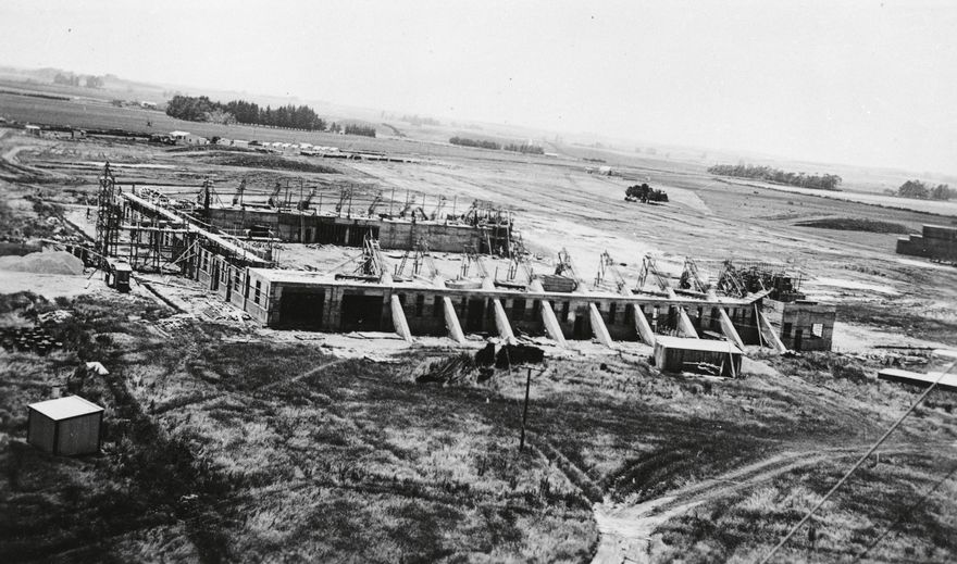 This photographs shows an air force hangar under construction at Ohakea Base.