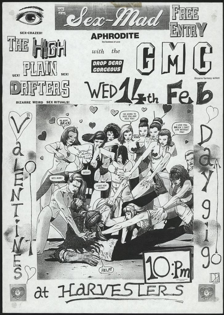 Sex-Mad. Aphrodite. Free entry. The High Plain Drifters. With the drop dead gorgeous GMC. Bizarre fantasy action. Wed 14th Feb. Valentines Day gig. 10:pm. at Harvesters. Part of a collection of posters that were displayed at The Stomach, Lombard Street, venue for Creative Sounds Society Incorporated.