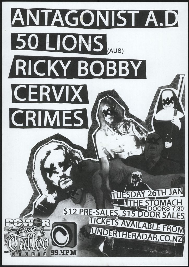 Antagonist A.D., 50 Lions (Aus), Ricky Bobby, Cervix, Crimes. Tues 26th Jan. The Stomach. Doors 7.30. $12 pre-sales. $15 door sales. Tickets available from undertheradar.co.nz. Part of a collection of posters that were displayed at The Stomach, Lombard Street, venue for Creative Sounds Society Incorporated.