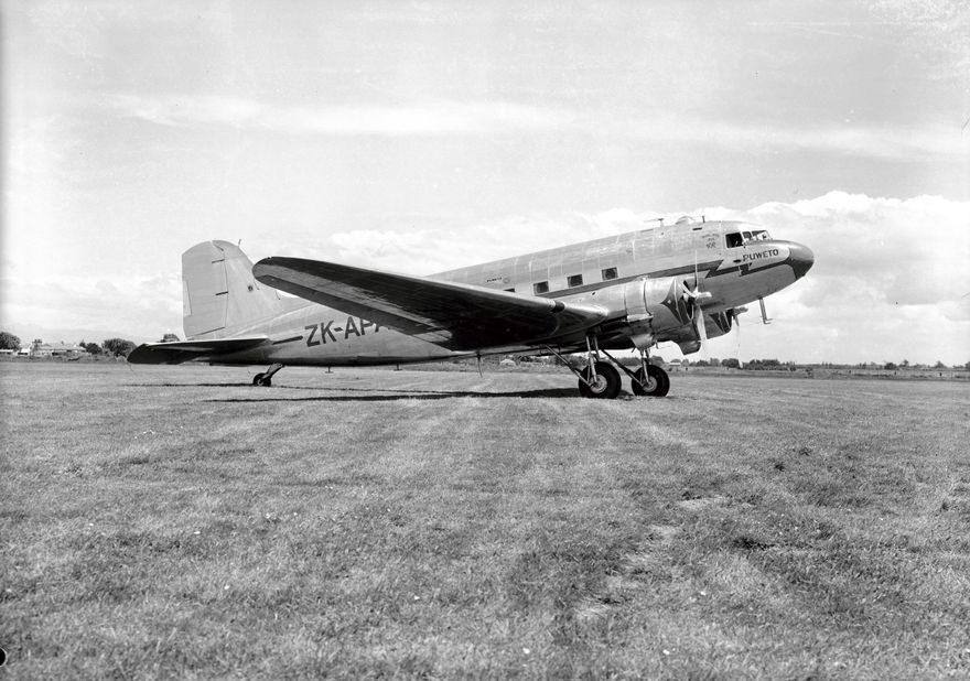 Douglas DC-3 ZK-APA aircraft [Puweto], thought to have been taken at Milson Airport, with the Royal Mail insignia panted near the cockpit. This airplane was used for military and civilian purposes. This photograph was almost certainly taken after 1947.