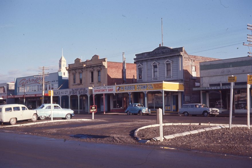 Shops shown are Garners Department Store, Falks NZ Ltd, Post Office Fish Shop, St Vincent de Paul Society Opportunity Shop, Palmerston North Rubber Stamp Co Ltd and Lamerton Ltd Grocer and Health Food Specialists. The T&G building clock tower on Broadway Avenue can be seen on the sky line.