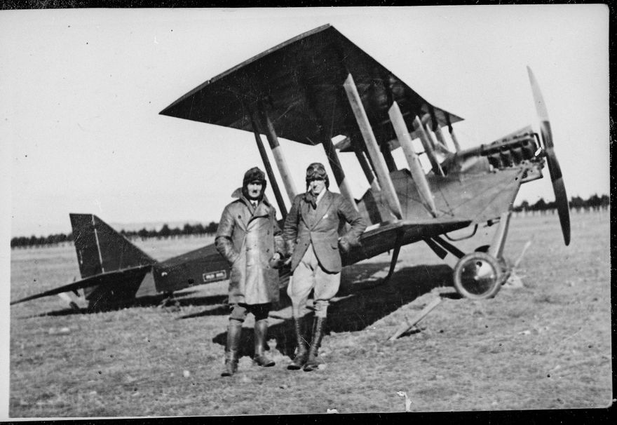 Captain Russell and H E Hibbard with Walsh Brothers DH6 aeoplane, Dannevirke