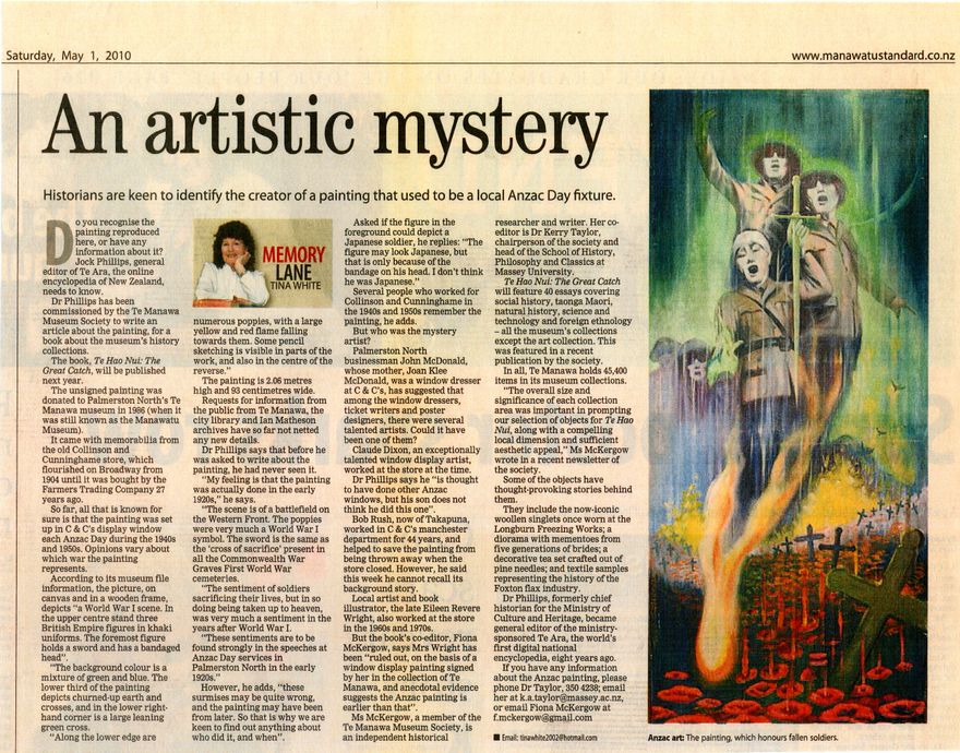 Journalist Tina White's weekly "Memory Lane" article in the Manawatū Standard. Mystery surrounds an unsigned painting donated to Manawatu Museum in 1986. It came with memorabilia from the old Collinson and Cunninghame department store. The painting, depicting three soldiers, was set up in the store's display window each Anzac Day during the 1940s and 1950s. The relevant war, and the artist who painted the work, are unknown.