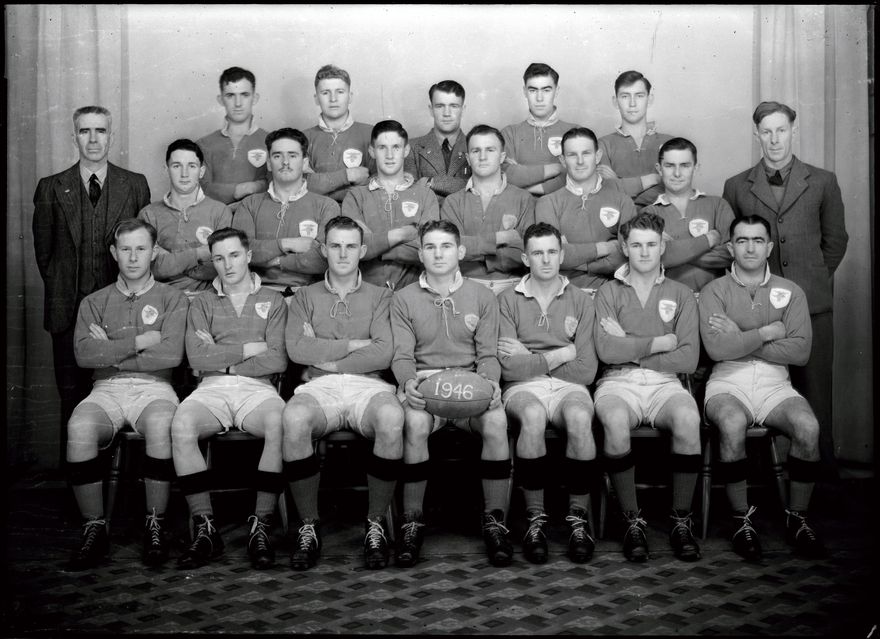 This photograph shows the Massey Agricultural College Student Football group posed for their official photograph in 1946.