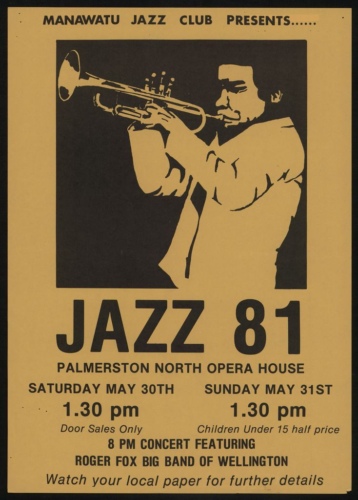 Manawatu Jazz Club presents.....Jazz 81. Palmerston North Opera House. Saturday May 30th 1.30pm, Sunday May 31st 1.30pm. Door sales only. Children under 15 half price. 8pm concert featuring Roger Fox Big Band of Wellington. Watch your local paper for further details." Part of a collection of posters that were displayed in the Public Library in the 1970s - 1980s.