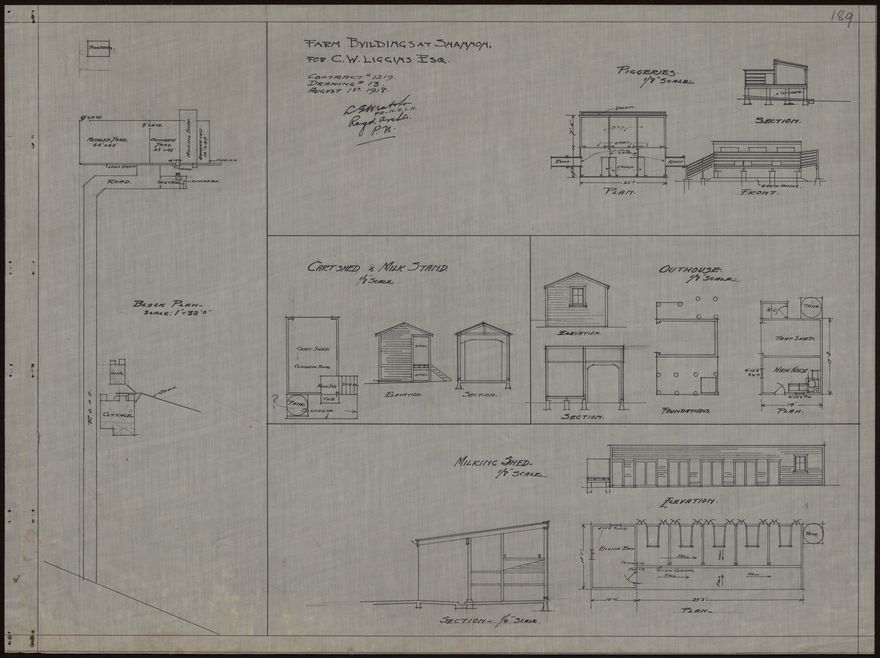 These plans for a three bedroom cottage, a two bedroom cottage, out house, milking shed, cart shed, milk stand and piggeries were designed by L. G. West and Son for C. W. Liggins. The Danish-born architect Ludolph Georg West (1846-1919) established an architectural practice in Palmerston North in about 1880. In 1912 he formed a partnership with his son, Ernest Vilhem West, who continued the business after his father's death.