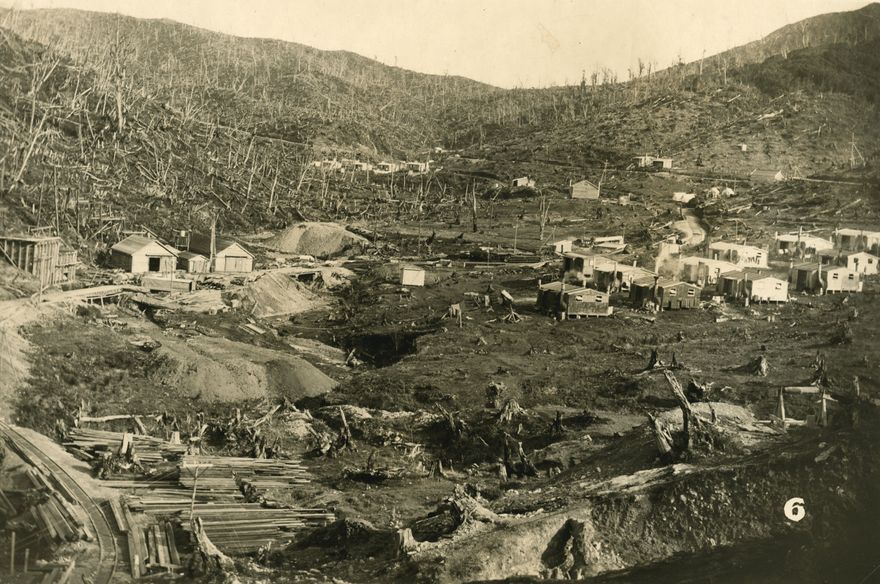 This photograph is part of a collection relating to the Mangahao Electric Power Scheme and its construction. The Scheme provides hydroelectric power, and is situated near the town of Shannon. It serves Wellington, Horowhenua, Taranaki, Hawkes Bay, and the Wairarapa. After being delayed by the first world war construction began in late 1919 and the station opened in November 1924. The large white building in the right-hand middle distance is the office.
