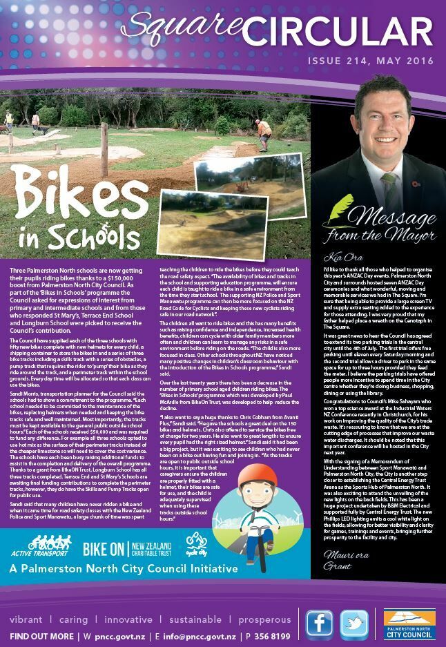 The Square Circular was Palmerston North City Council's monthly community publication, informing Palmerstonians of PNCC initiatives, activites, and events. This month's issue includes: Bikes in schools, Grant Smith; gardening; Civil Defence; Central Energy Trust Arena; science award; public consultation; draft heritage strategy, bylaws; councillor contact details; council meetings.