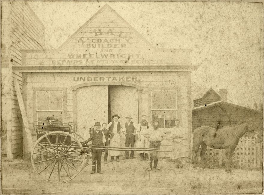 T. Hall was a coachbuilder. The business was in Rangitikei Street. T. Hall coach builder, the right window side was Wheelwright Bus and the left the undertakers. There was a courtyard right through.