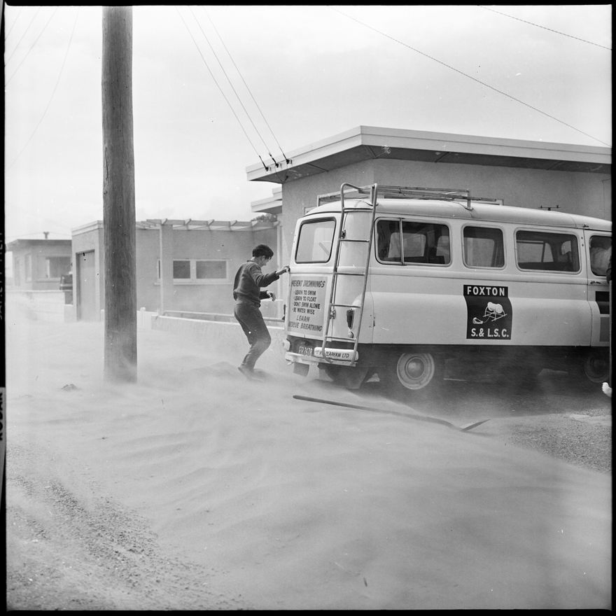 This image was taken (but not used) for a story that ran in The Manawatu Evening Standard on 28th December 1965 "Rough seas aggravated by a gale force wind lashed some inland at Foxton Beach today. The members of the Foxton Life-saving Club had to shovel sand away from the club's driveway before they could drive the surf life-saving van out. Sand carried by the strong wind had built up along the edges of the road causing difficulty to some motorists. They wind was one of the strongest experienced at the beach for some time."