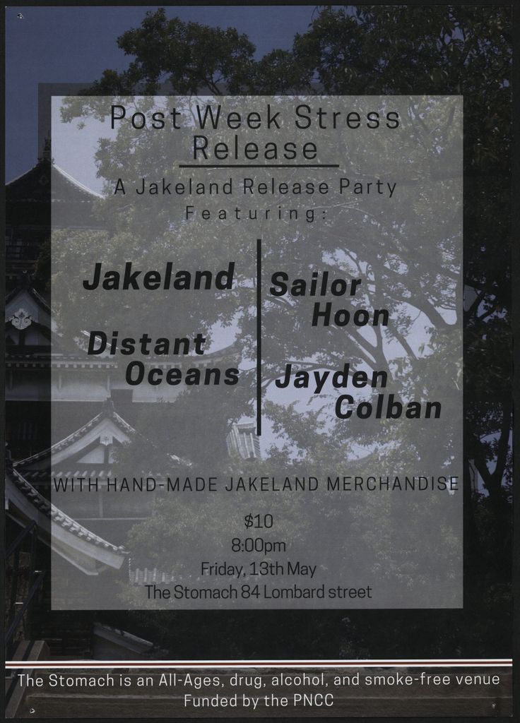 Post Week Stress Release. A Jakeland Release Party Featuring: Jakeland. Sailor Hoon. Distant Oceans. Jayden Colban. With handmade Jakeland merchandise. $10. 8:00pm. Friday 13th May. The Stomach 84 Lombard street. The Stomach is an All- Ages, drug, alcohol, and smoke-free venue Funded by the PNCC. Part of a collection of posters that were displayed at The Stomach, Lombard Street, venue for Creative Sounds Society Incorporated.