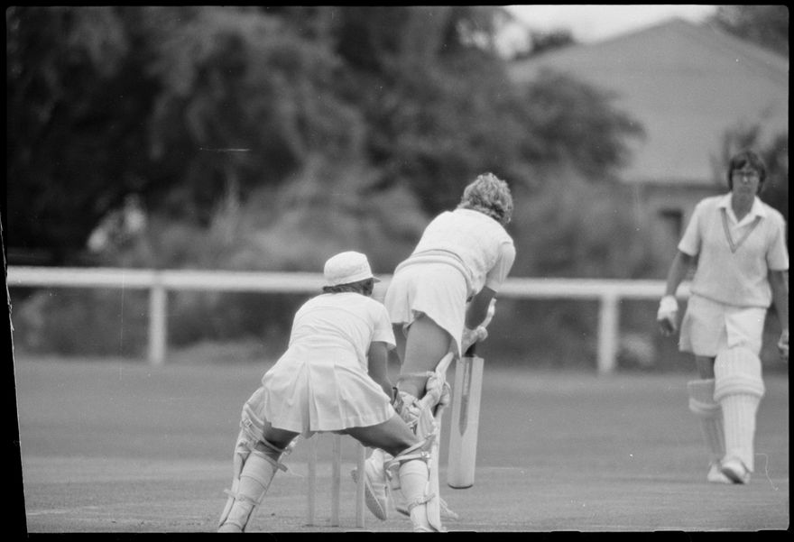 This image was taken (but not used) by the Evening Standard on 20th of January 1982 and published on the 21st. It depicts the Australian women’s cricket team taking on the International XI women’s team in a limited over match for the Hansell's Vita Fresh Women's World Cup 1981/1982. The match was held at Fitzherbert Park in Palmerston North. The Australian team won by 64 runs.