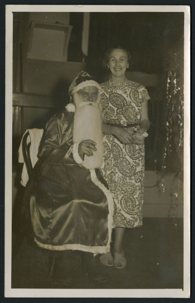 Jack Evans dressed as Father Christmas, and Betty Evans, at Kia Toa Clubrooms. Jack and Betty married in 1936 and had a family of four boys. They were early and long term residents of the Savage Crescent state housing precinct, living at 5 Mansford Place.