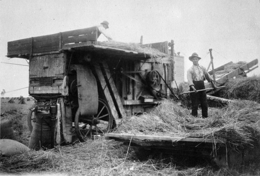 The Clayton & Shuttleworth threshing mill, powered by Gifford and Henson's Aveling & Procter traction engine, working in the Mount Stewart area.