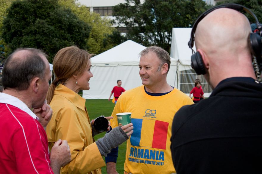 TV One News sent breakfast reporters Tamati Coffey and Petra Bagust to cover the early morning ‘Rippa Rugby’ game between local school children representing the nations of Romania and Georgia who were set to play their Rugby World Cup match in Palmerston North later that night.