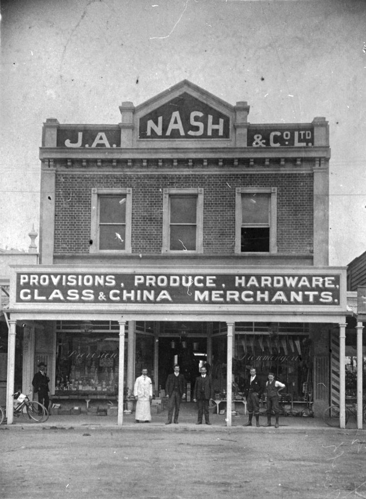 This shop was built for J A Nash and Co. in 1906 on the northern side of Coleman Place, and ran through to Cuba Street. The 'front shop', as shown, contained groceries to the left and ironmongery to the right. Staff in 1906 included Mr W White, Mr EW Simmons and Mr L Sutton (manager), who may be pictured. Nash’s partners included H.S. Porteous, L. Sutton, and J.S. Watchorn. James Arthur Nash served as Mayor of Palmerston North 1908-1923 and Member of Parliament for Palmerston North 1918-1935. Geoffrey Watchorn is the young man standing second from right in the photograph but there is no evidence that he worked for J.A. Nash. He worked instead for Arthur Hopwood in the shop on the corner of The Square and Coleman Place from the age of 17 years, starting in 1905.