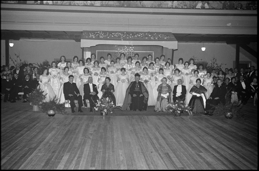 Caption: “The 37 debutantes photographed after being presented to Monsignor Herlihy, who is now in Karori, was for many years in Palmerston North.”