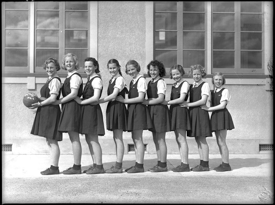 The Tangaroa 'B' basketball team. Basketball is now called netball. Palmerston North Intermediate Normal was opened in 1941 in Ferguson Street.pose for this photograph with big smiles.