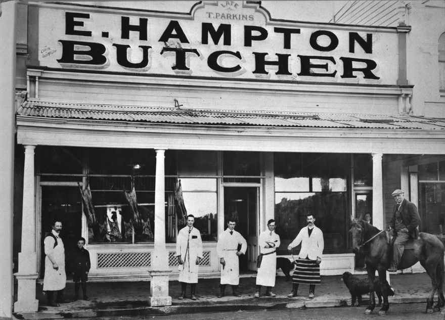 The butchery stood on the south-eastern side of The Square, between the then Bank of New Zealand and the All Saint's Church. Above the shop sign, another sign identifies the shop as 'Late T Parkins'. The building was later remodeled and in the 1960s was occupied by the Kairanga Meat Co. butchery. This photograph was published in the Manawatu Cookery Book of 1913.