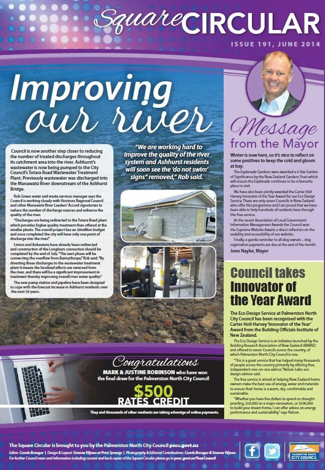 The Square Circular was Palmerston North City Council's monthly community publication, informing Palmerstonians of PNCC initiatives, activites, and events. This month's issue includes: Manawatu River; Jono Naylor; Eco Design Service; Te Manawa; Matariki; library; awards; website; heritage; archives; Victoria esplanade; recycling; eco design; SafeCity angel; civil defence.