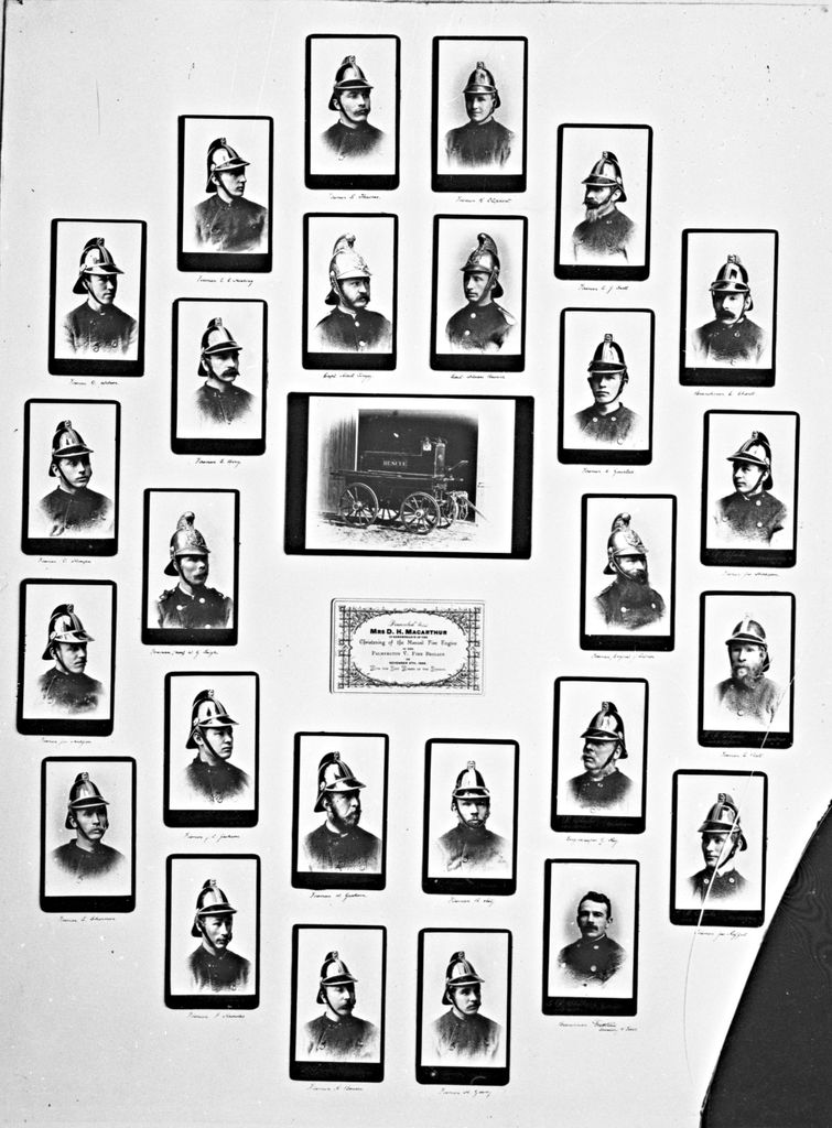 This photograph was part of a set of smaller photographs, showing portraits of the firemen in uniform. The following information is found on the back of the photograph: 'Present to Mrs D.H. MACARTHUR [wife of the Member of Parliament for Palmerston North] in remembrance of the Christening of the Manual Fire Engine of the Palmerston Volunteer Fire Brigade on November 9th, 1888. With the Best Wishes of the Brigade'. Names of Men - Outer Ring (clockwise from top centre): Fireman R Oliphant, Fireman C J Scott, Branchman C Shortt, Fireman J N O Hodgson, Fireman C Platt, Fireman Jas. Moffatt, Branchman Fred Pirani (Secretary and Treasurer), Fireman H Gowdy, Fireman A Bowers, Fireman F Knowles, Fireman C Sharman, Fireman Jas. Hodgson, Fireman V Kroupa, Fireman D Wilson, Fireman C E Hosking, Fireman S Thacker. Inner Ring (clockwise from top centre): Lieutenant William Rawlins, Foreman C Gaustad, Foreman (engine) J Salmon, Engine Keeper G Key, Fireman R Relf, Fireman W Graham, Fireman J O Jackson, Foreman (hose) W G Leigh, Fireman C Urry (?), Capt. Albert Tingey.