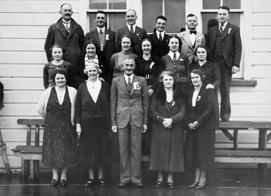 From left. Back row: Max Burmeister; Oliver Collis; Unknown; Ian Davey; George Davey; Frank Cummins (head teacher at school). Middle Row: Thelma Davey; Unknown; Eileen Burmeister; Rene Green; Olive Green; Betty Hughes. Front Row: Unknown; Mrs Millie Green; Bill Matheson.