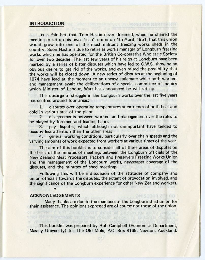 This booklet outlines industrial disputes at the Longburn freezing works during the 1970s, specifically: disputes over operating temperatures at extremes of both heat and cold; disagreements between workers and management over the roles of foremen and leading hands; pay disputes; and general working conditions and workloads.