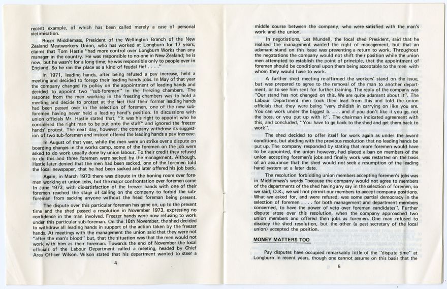 This booklet outlines industrial disputes at the Longburn freezing works during the 1970s, specifically: disputes over operating temperatures at extremes of both heat and cold; disagreements between workers and management over the roles of foremen and leading hands; pay disputes; and general working conditions and workloads.