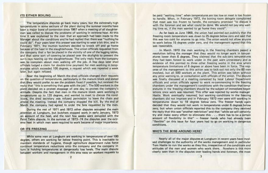 This booklet outlines industrial disputes at the Longburn freezing works during the 1970s, specifically: disputes over operating temperatures at extremes of both heat and cold; disagreements between workers and management over the roles of foremen and leading hands; pay disputes; and general working conditions and workloads.