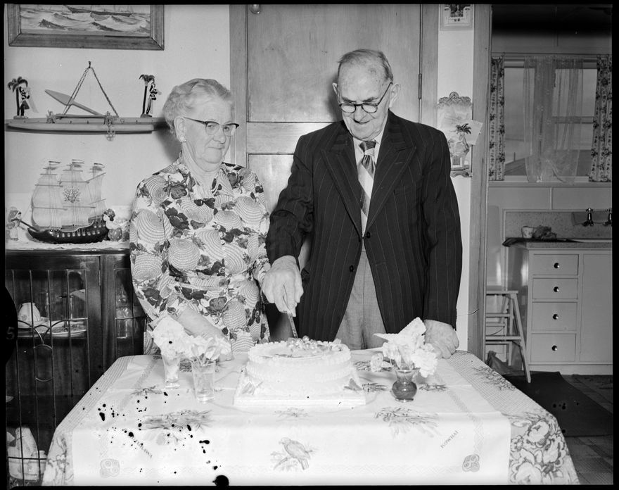 This image was taken for a story that ran in The Manawatu Evening Standard on 15 December 1960 "Today marks the 60th anniversary for Mr. and Mrs. J.T. Baylis, of Papaioea Place, Palmerston North. They are seen cutting an attractive wedding cake at a family gathering."