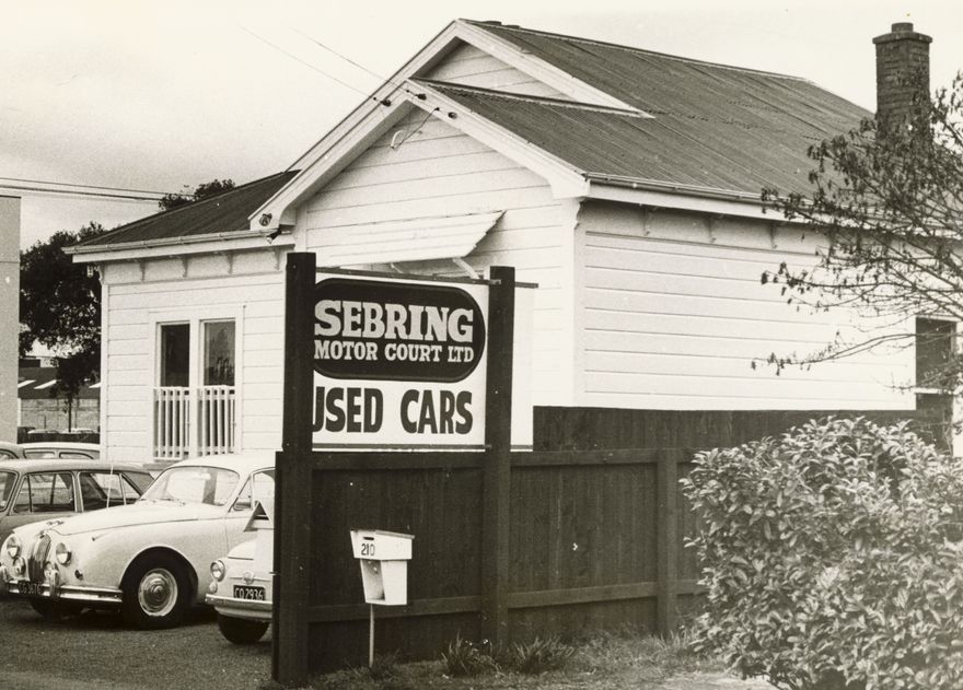 This house on the corner at 212 Featherston Street, Palmerston North, was converted to use as business premises for Sebring Motor Court Ltd, a used cars dealership.