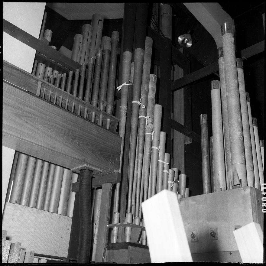 This image was not published in The Manawatu Evening Standard. Church Organ pipes being installed at the St. Peter's Church. Another image of the pipes was published on 26 June, 1963.