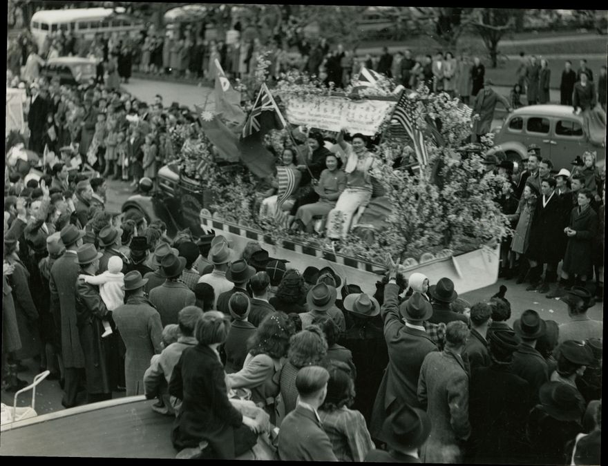 Japan surrendered to the allies of World War II on 15 August. Immediately schools and businesses in Palmerston North were closed and celebrations, many informal, began. A thanksgiving service was held that afternoon, followed by a victory parade the next day. The parade attracted a big turnout of civilians and defence personnel, a flotilla of 130 vehicles of all kinds, and a huge number of spectators lining the streets. The procession began at the Police Station and went around The Square, lead by the Manawatu Scottish Society’s Highland Pipe Band. This float, entered by the Chinese community, featured chinese women amongst blossom waving flags. The parade was followed by community sing-song led from the Band Rotunda.
