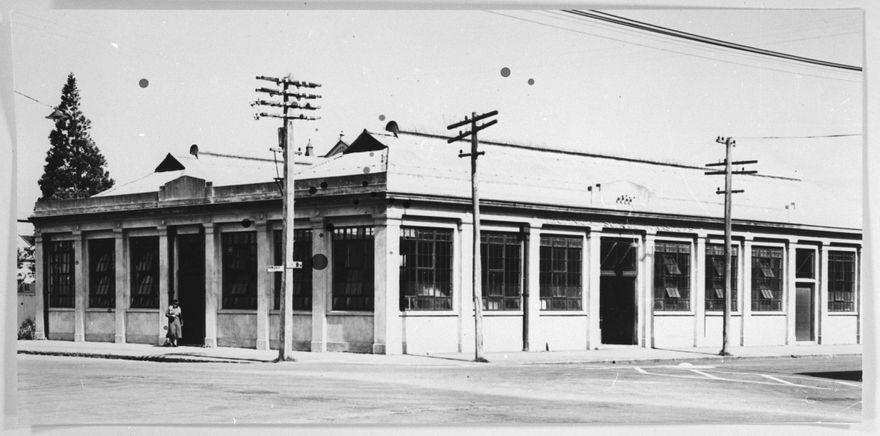 The Technical School workshops on the corner of King and Princess Streets. They were built in 1935. In 1931 the main building was strengthened and the gables were removed. The Palmerston North Technical School occupied the building until 1956. It is now used by the Universal College of Learning (UCOL).