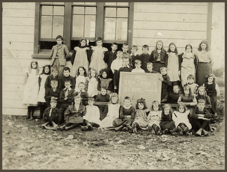 The Rangiwahia School in 1912 with F C Campbell as Head Teacher. The school was opened in 1895 with the a class roll of 37. It was later enlarged to accommodate 60 pupils. The School grounds consisted of four acres with the Kiwitea Stream flowing through it.