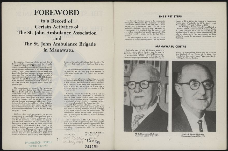 Includes a history of the organisation and details about members. See also the Supplement to History of the St John Ambulance Association Manawatu, 1900-1975, which updates the information to 1983.