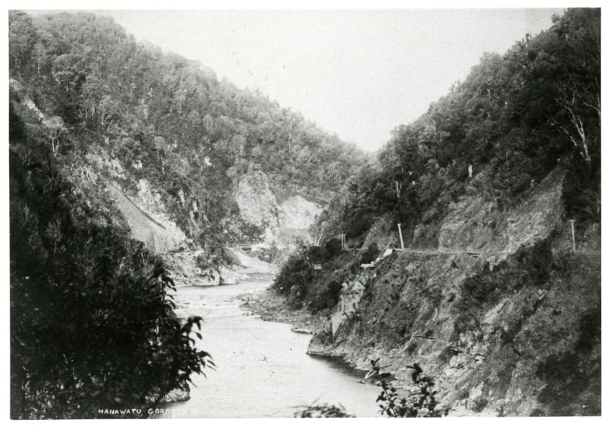 - Reverse reads: - This view is taken from the road opposite the first tunnel, on the right is seen the Palmerston-Napier road. The broken water is the first, and most dangerous rapid in the Gorge, on this side of which is seen, steps, wire-rope and cage for crossing to the east end of the long tunnel; above the rapid, by use of a reading glass, another wire-rope can be seen near the west end of second tunnel. From river-bed above second rope, to about one inch down from the lend hand top corner of the view, is seen portions of the 'big slip' and where it slipped from, this the second slip here, the first cost £ 2000 to remove and this would cost about £ 6000 so the tunnel was deviated and lengthened about 9 chains, above this is seen a portion of an iron railway bridge, at east end of the tunnel, and which spans the Niagara Creek, and which requires no other explanation than its name. The Manawatu River rises about 54 ft, and the road and railway is about 20ft. above flood level. - R McGonagle 1888