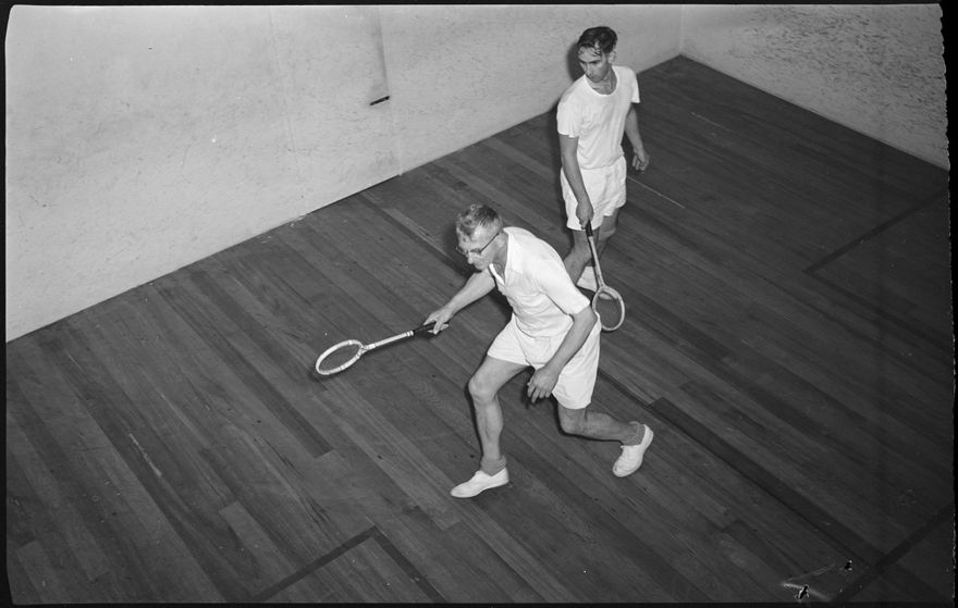 This image was taken for a story that ran in The Manawatu Evening Standard on 9 August 1958, page 8: "A hard-fought match in the second round of the men's A grade championships of the North Island squash rackets tournament being conducted in the city. D.D. Mochan (Hawke's Bay), at the rear, beat A.H. Malcolm (Hamilton), 2-9, 9-6,9 -7, 9-4."