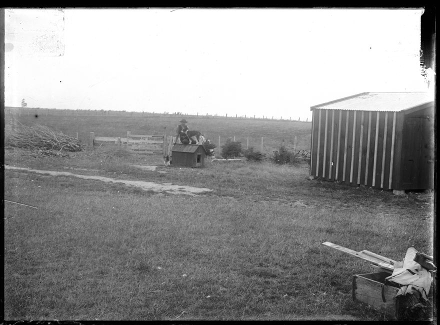 This photograph was created by William James Young in the early 20th century. A large variety of subjects are depicted in the collection, but family, rural life and travel are the most prominent themes. The exact location of the photographs in the Young Collection is unknown, but W J Young lived on a farm in Mt Stewart, Rangitikei, and some of the photographs include his house. The Young family were apparently avid travellers and photographs later in the collection feature scenes from Rotorua, Auckland, Whanganui, as well as other unidentified locations. The portraits are all unidentified, but are presumably of members of the Young family. The photographers parents were George Henry (b 1833) and Jane McDowell (b 1842, d 1916). They came to New Zealand in 1877. The same year, they bought the home farm on Mt Stewart and called it Kilrudden after Kilrudden House, the home of the McDowell family in Ireland. The couple had four children: Ann (b 1873), Margaret (b 1876), John (b 1878) and William James (b 1880). William James married Mary Elizabeth Thompson and they had four children: Doris (b 1914, d 1989), George (b 1916, d 1991), Royden McDowell (b 1925, d 1992) and Noel William (b 1927, d 2013).