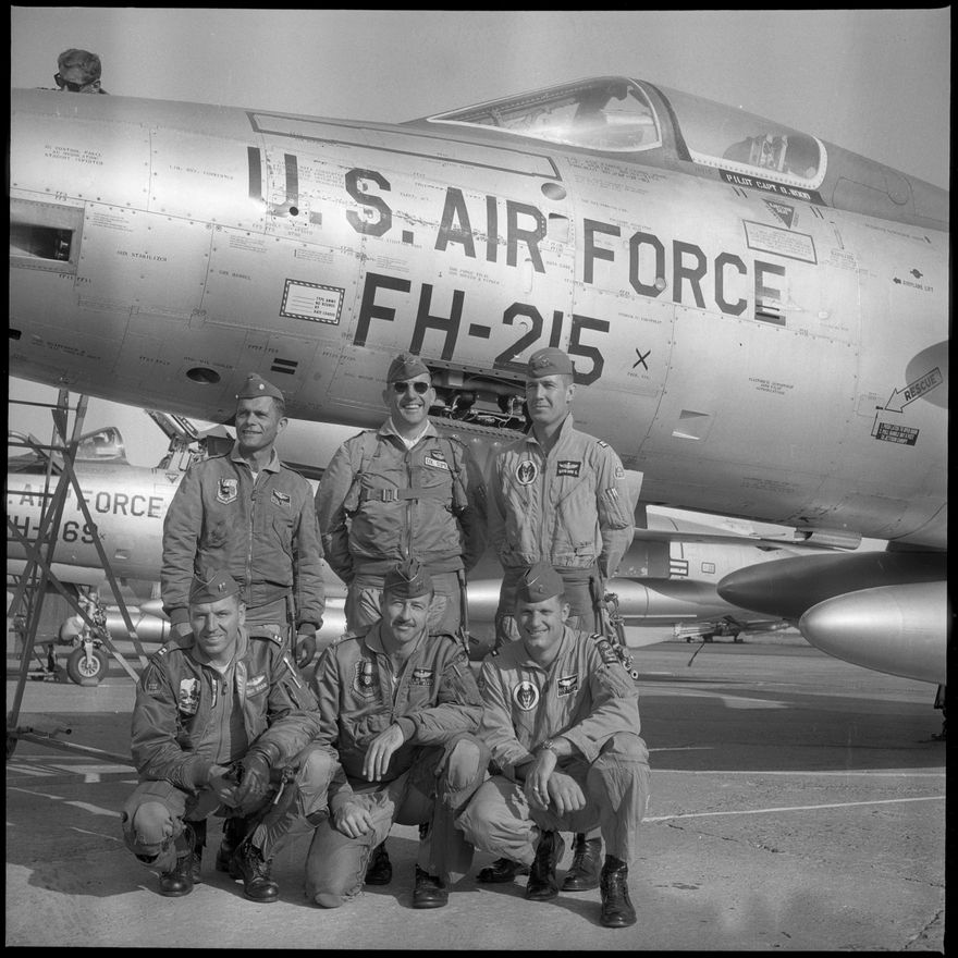 This image was not published in The Manawatu Evening Standard, taken on 17 February, 1964. "After a 7 1/2-hour non-stop slight from Guam on Saturday these six Thunderchief pilots were pleased to touch down at the R.N.Z.A.F. Station at Ohakea on Saturday. They are, from the left: Back row, B. Craig, the commander of the 18th Tactical Fighter Wing (Colonel G. B. Simler), D. C. Wood; front row, B. Bush, W. M. Dalton, D. Thompson." Another image of the group was published on 17 February, 1964.