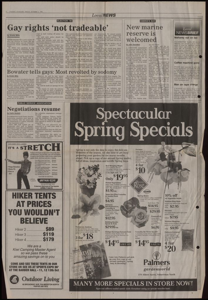 It also includes copies of letters between organisers Peter Pawson and Kevin Baston to both Fran Wilde (Member of Parliament who sponsored the Homosexual Law Reform Bill in 1985) and Rangitikei Member of Parliament Denis Marshall.